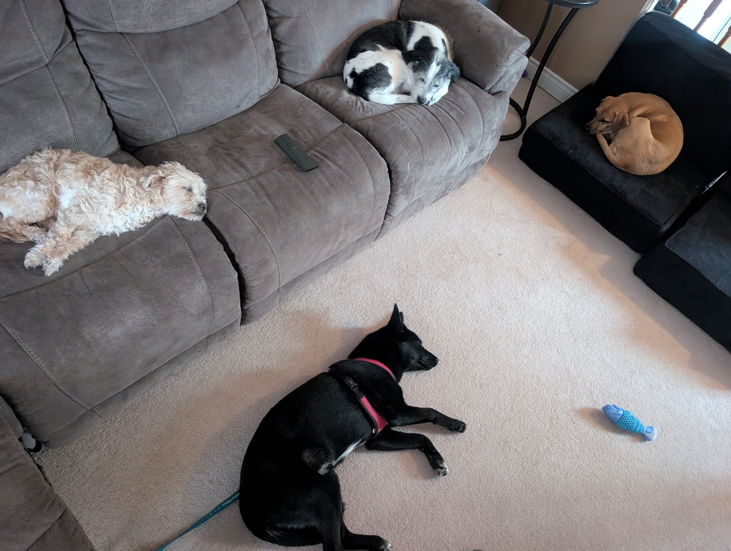 Our adoption fees cover all up to date veterinary needs, including but not limited to: full veterinary examination, age appropriate vaccinations, fecal test and parasite prevention, wellness bloodwork, spay or neuter, and microchip. All dogs will be started on a 6 week trial of pet insurance after adoption. Local adopters can take advantage of 50% off a training course at Ruff Haus in Barrie (www.ruffhaus.ca) and all adopters will also be signed up for Petcademy to offer 30 days of free text-based behavioural support.