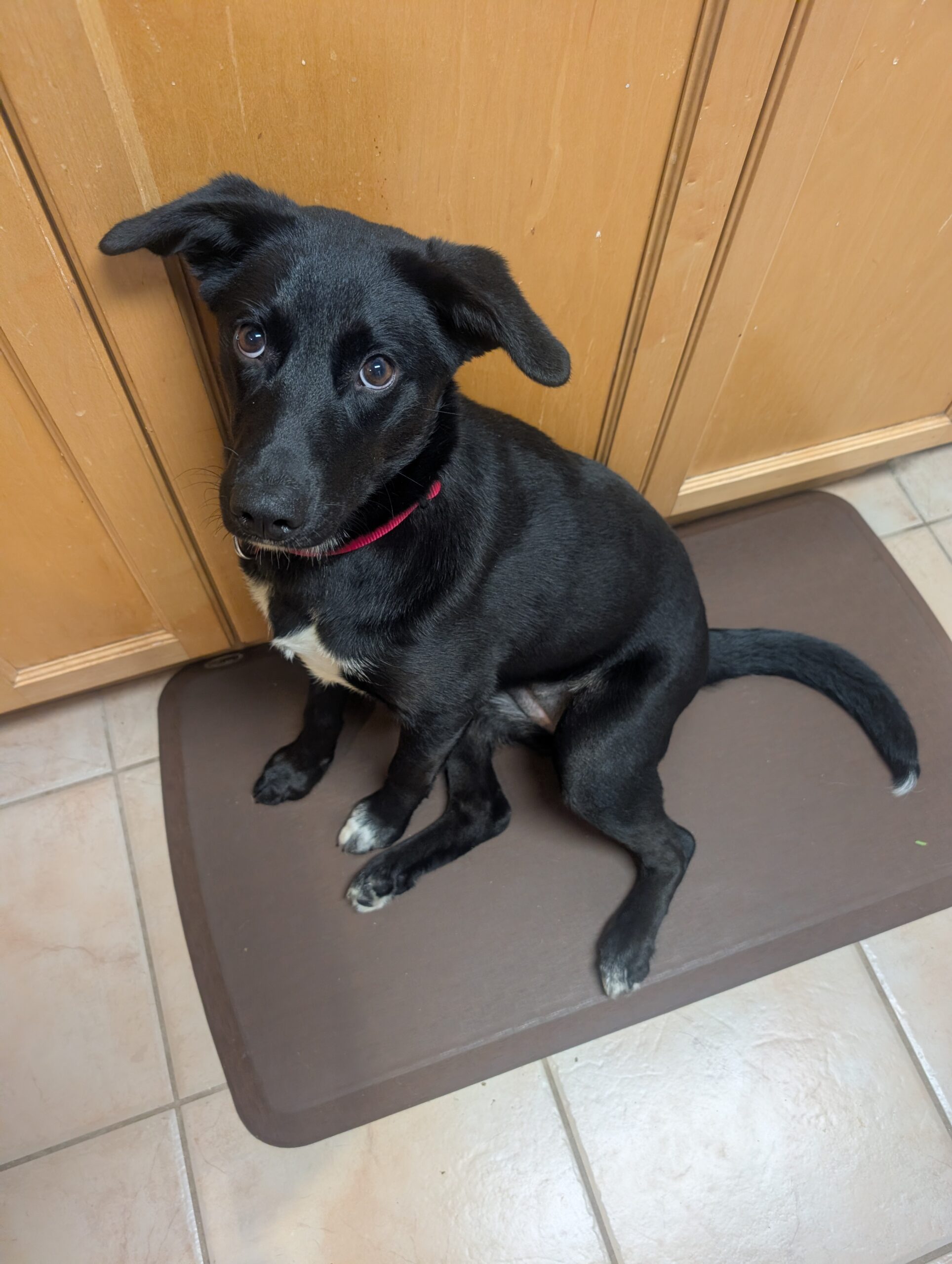 Flower’s learning her manners and is already crate and largely house trained. She knows “sit,” “stay,” “down,” “off,” and “come,” and is working on leash skills. She can get jumpy when excited, but she’s clever, eager, and quick to learn.