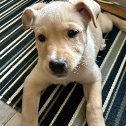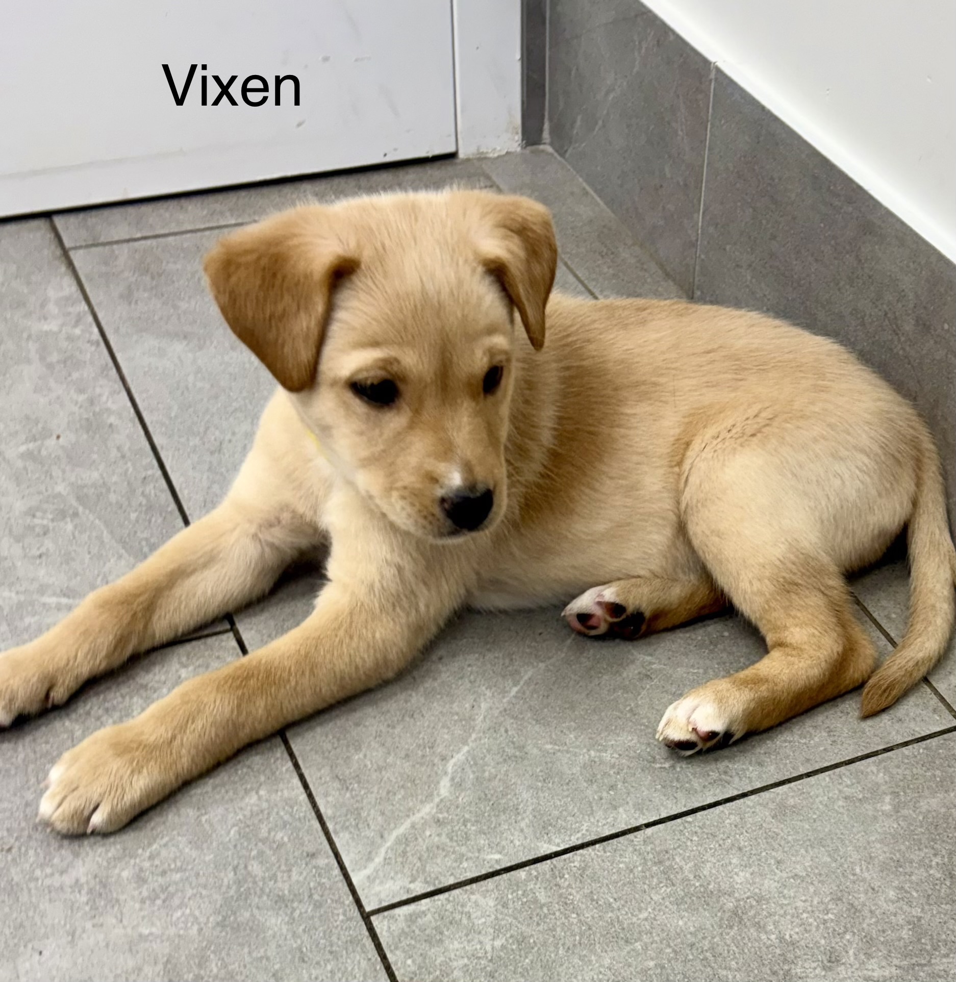 Vixen is a smart, curious pup who’s already hard at work learning her big-dog manners. She’s working on potty training, with just the occasional indoor accident, and will often whine or go to the door when she needs to go out. Leash training is still a work in progress, and like many young pups, she’s learning that nipping, grabbing clothes, and jumping up are not the best ways to say hello.