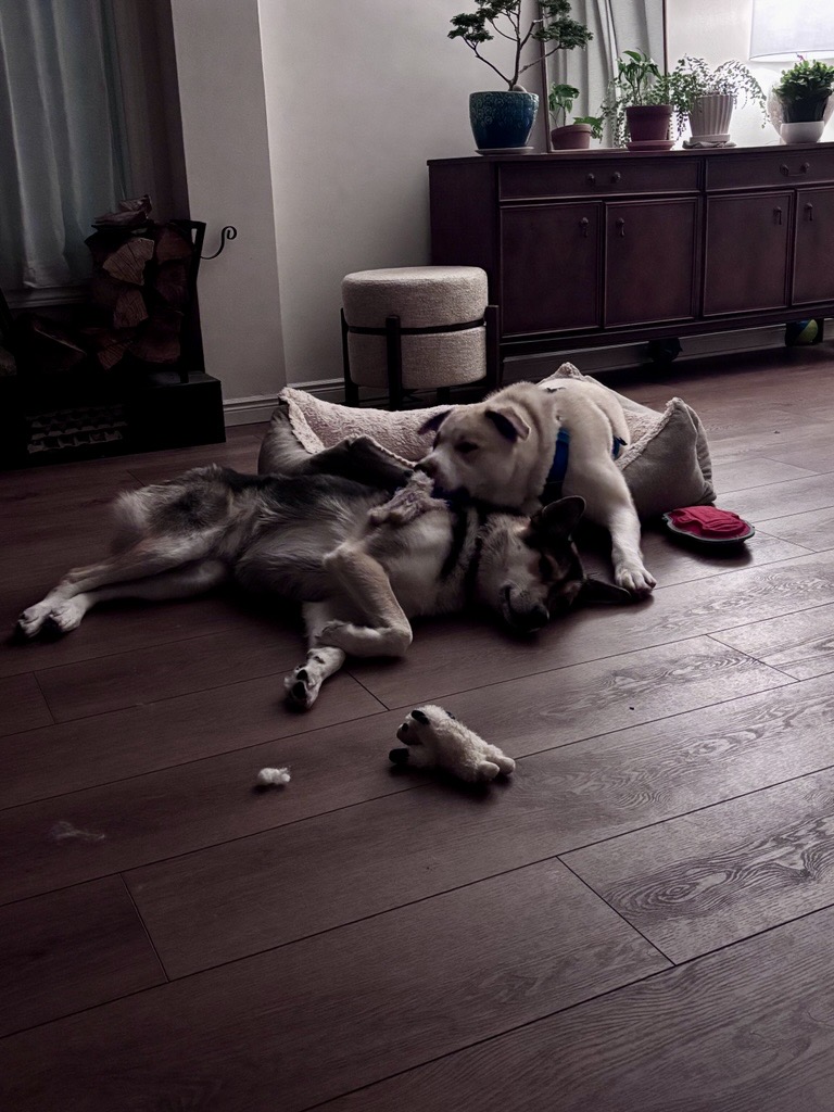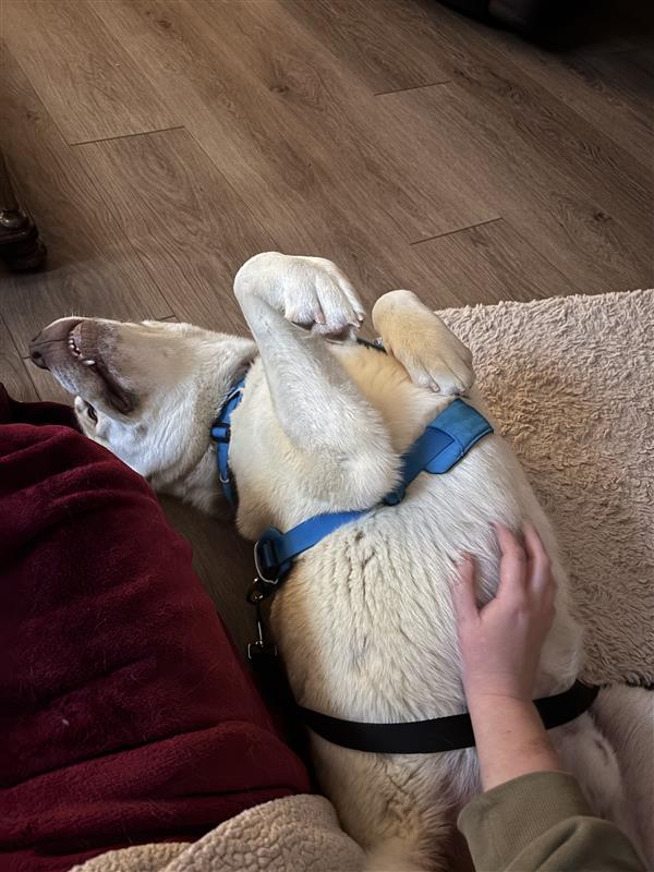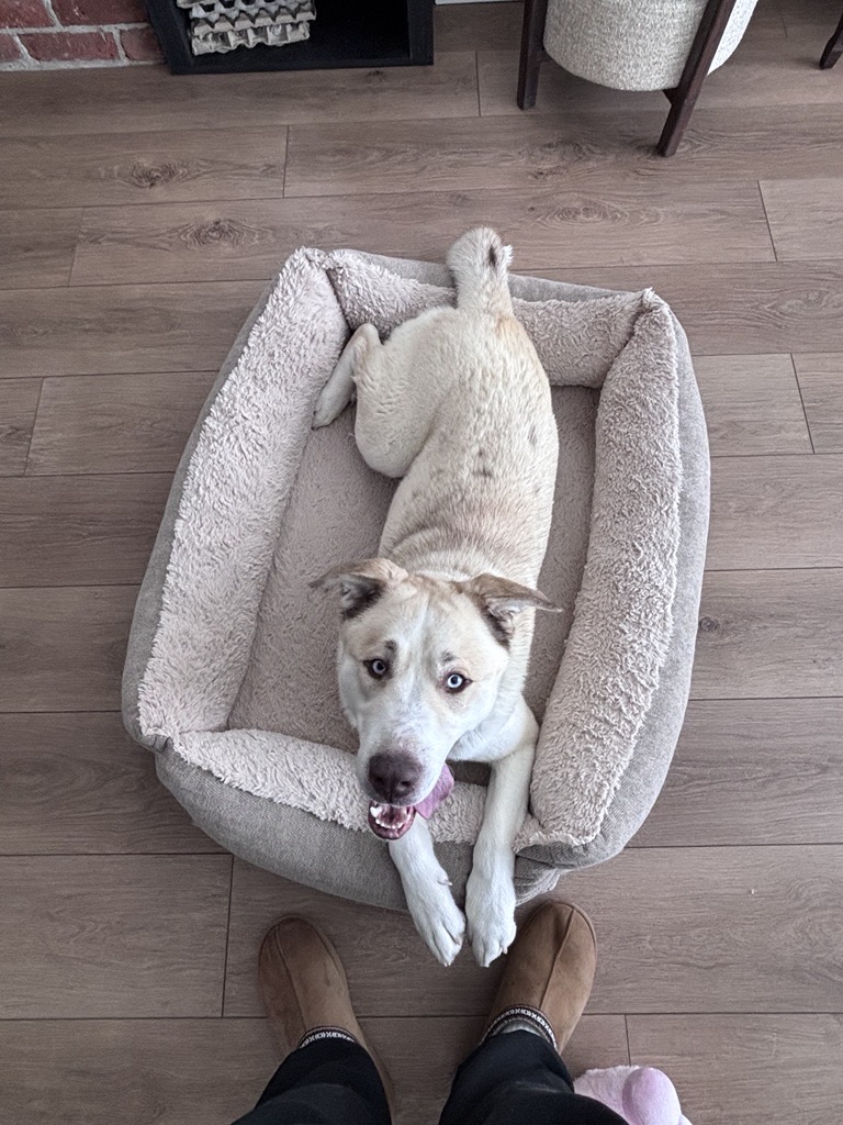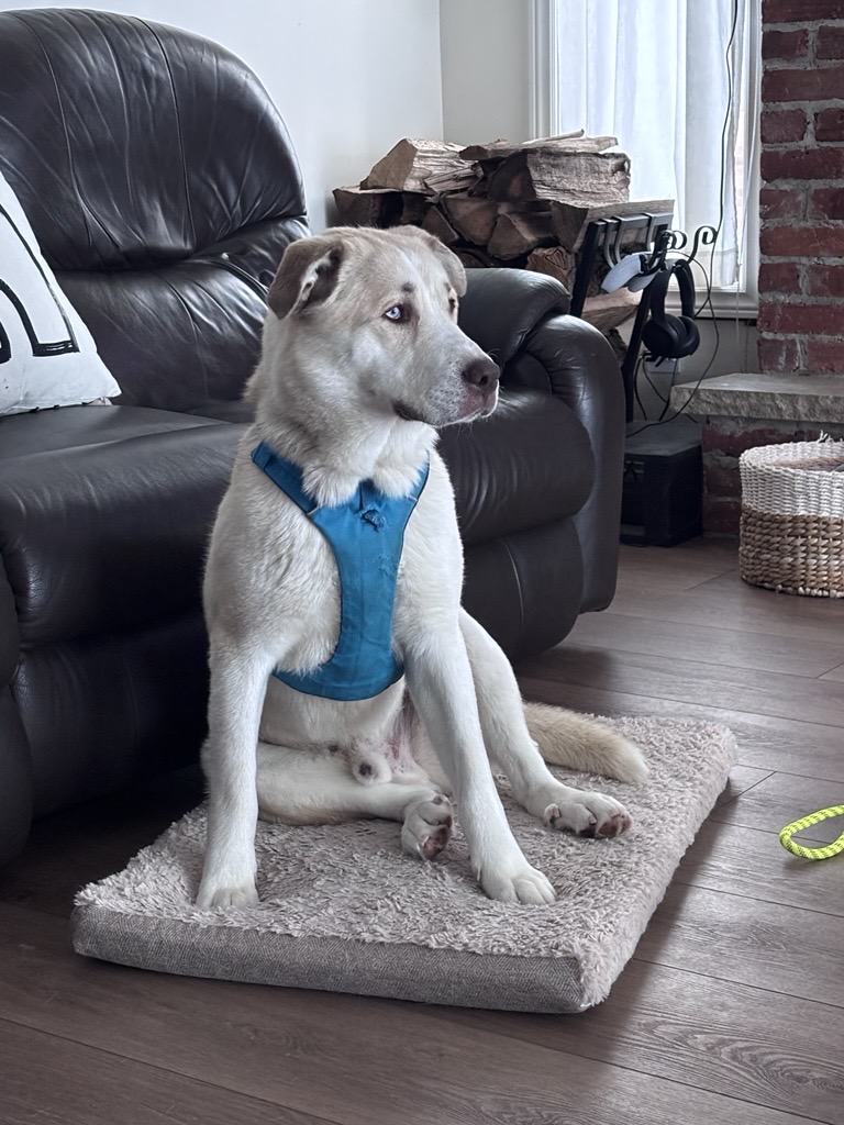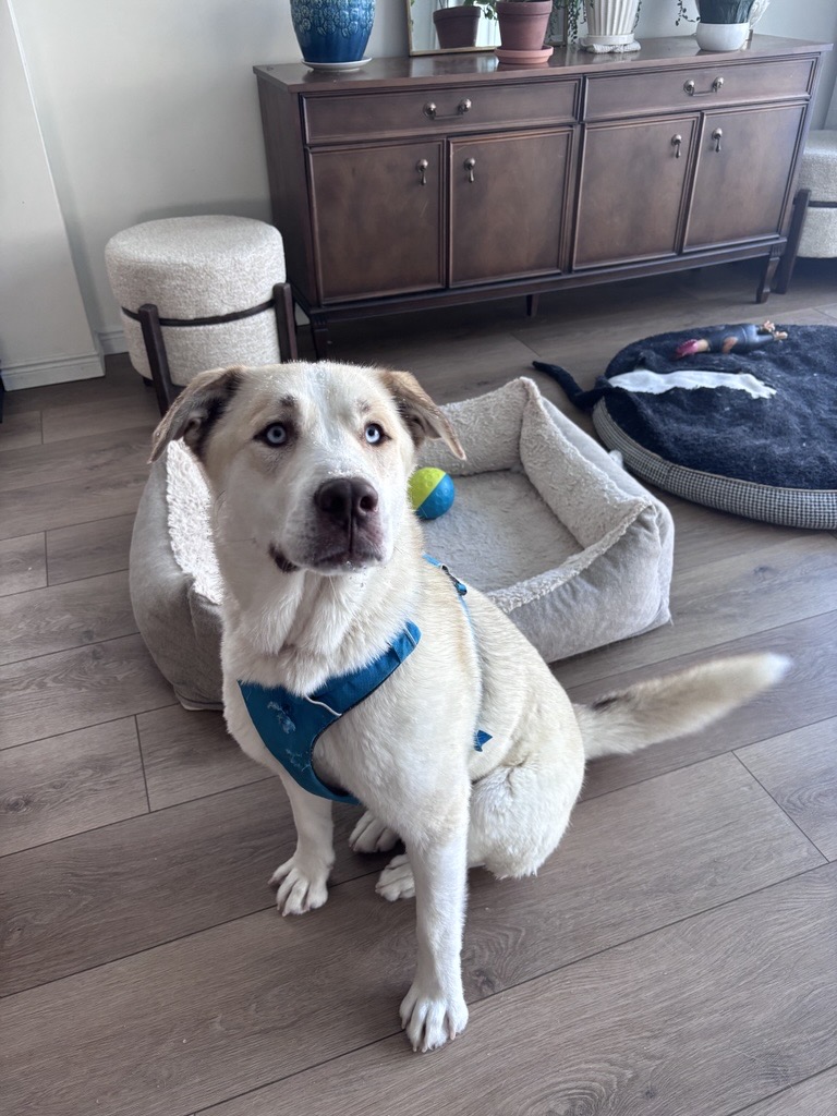 Cosmo already has a solid training foundation and continues to learn every day. He knows sit, down, off, come, and leave it, and is working on polishing his manners with consistency and positive reinforcement. He enjoys leashed walks and is generally unfazed by his surroundings, even if his path includes some enthusiastic zig-zagging as he takes everything in. He rides well in the car and settles nicely indoors, where he shows his calmer side by chewing on his favourite rope toy, tossing around his pink pig stuffy, and happily snoozing after playtime.