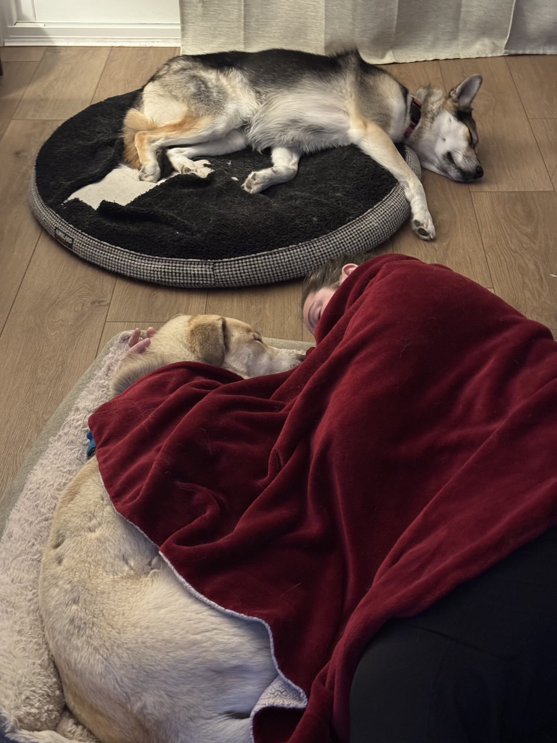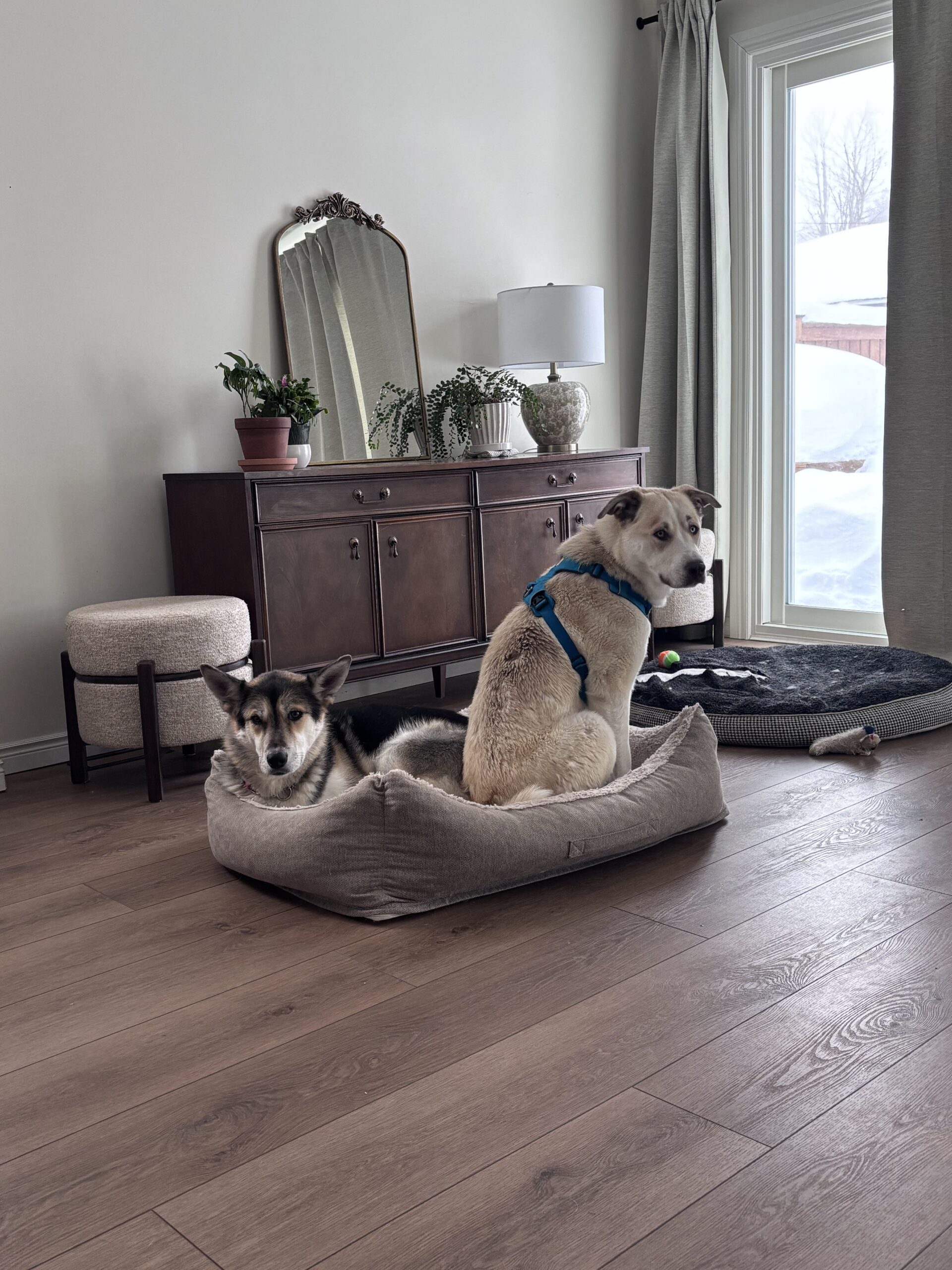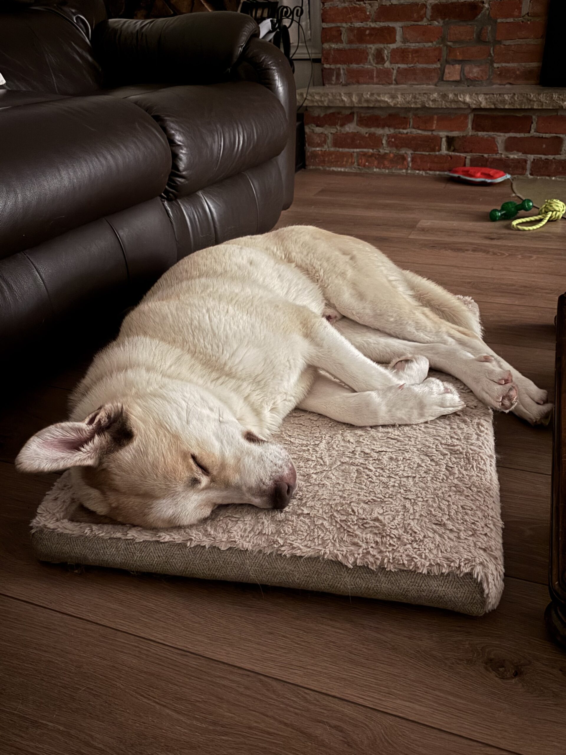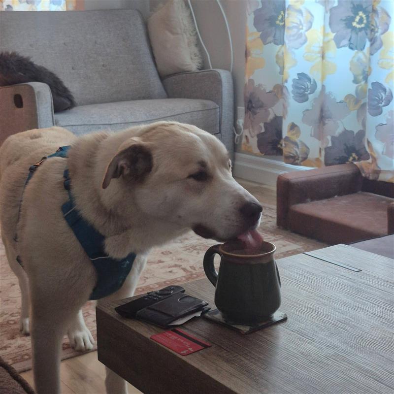 Cosmo already has a solid training foundation and continues to learn every day. He knows sit, down, off, come, and leave it, and is working on polishing his manners with consistency and positive reinforcement. He enjoys leashed walks and is generally unfazed by his surroundings, even if his path includes some enthusiastic zig-zagging as he takes everything in. He rides well in the car and settles nicely indoors, where he shows his calmer side by chewing on his favourite rope toy, tossing around his pink pig stuffy, and happily snoozing after playtime.