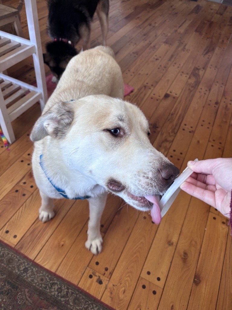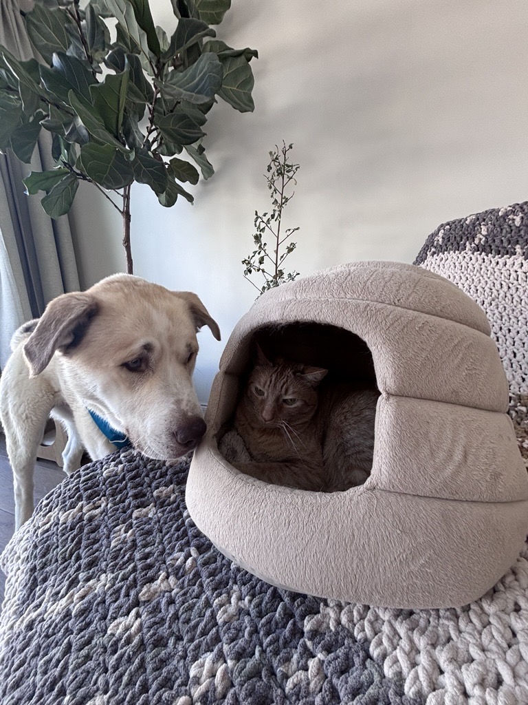 Like many young dogs, Cosmo has plenty of energy and sometimes forgets just how bouncy he can be. He loves to play with other dogs and can be enthusiastic about it, but he has shown good social awareness by responding appropriately when another dog sets boundaries. He has done well with a variety of dogs of different sizes and ages, and even spent a weekend with several dogs successfully. He is also doing well with the resident cat, showing curiosity without signs of prey drive. Cosmo has not yet lived with children in his foster home, but with his playful, puppy-like energy, he may do well with dog-savvy kids who are ready to help guide him with training, clear boundaries, and lots of positive reinforcement. Crate training is a work in progress. Cosmo will go into his crate willingly and is improving steadily, though he may vocalize briefly as he settles in, especially at night. Cosmo forms strong attachments to his people and can show some separation anxiety. He will thrive in a home committed to ongoing bonding, confidence building, and positive reinforcement training to help him feel secure and settled.