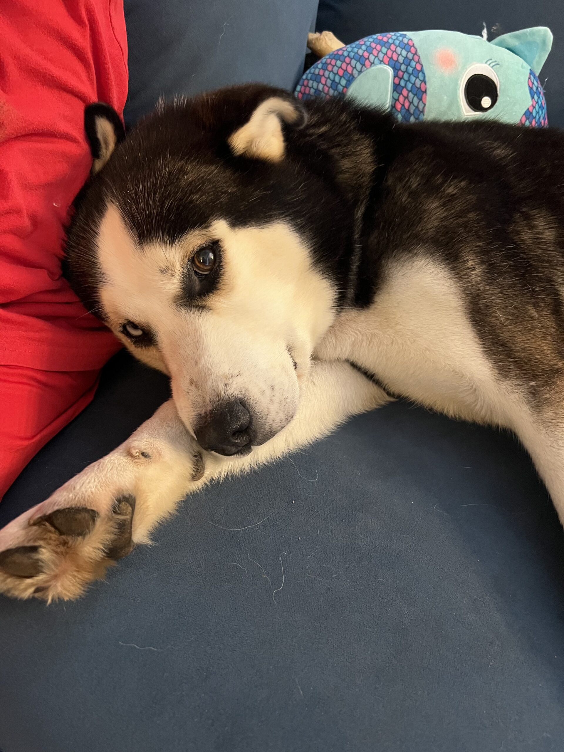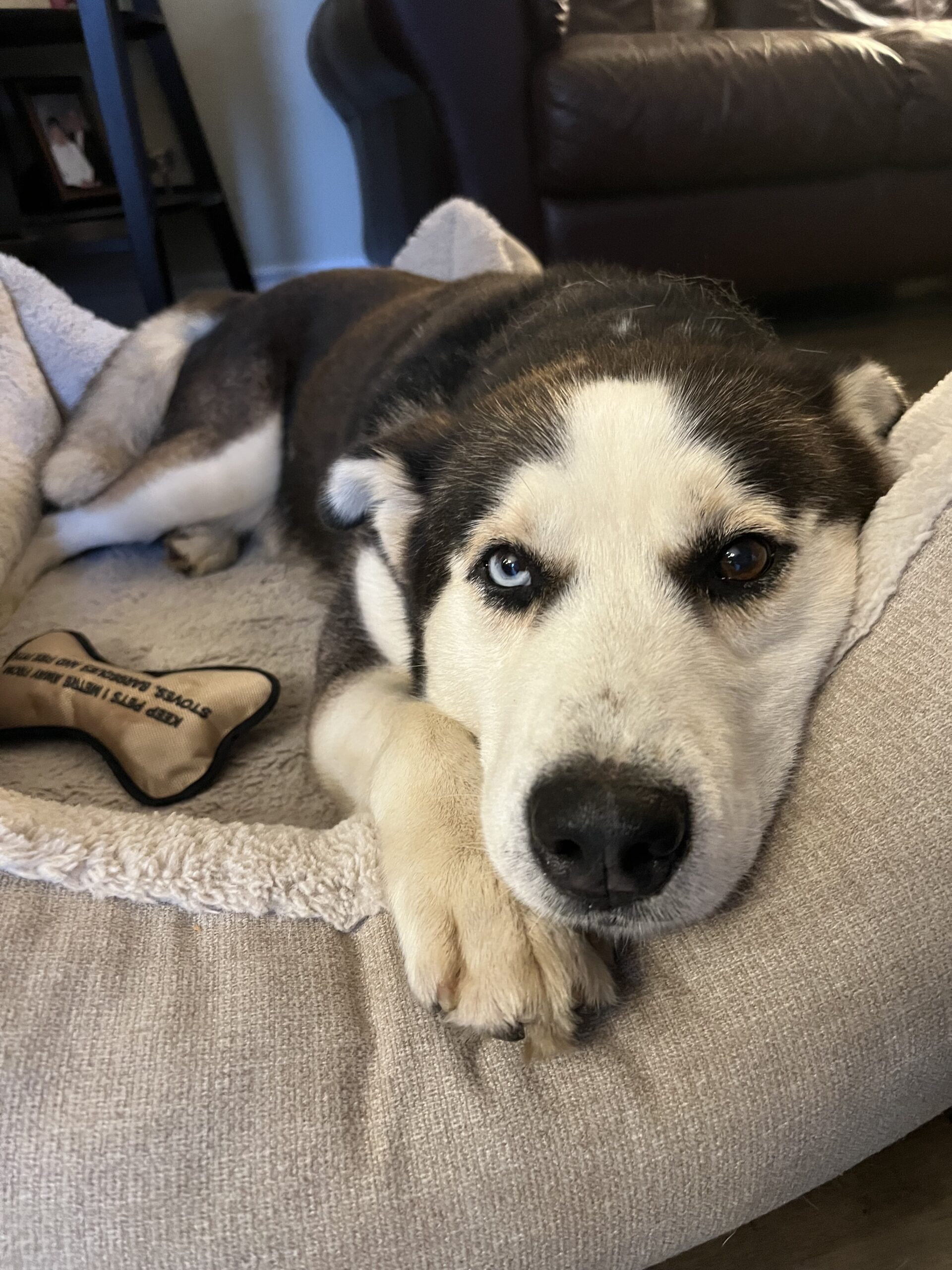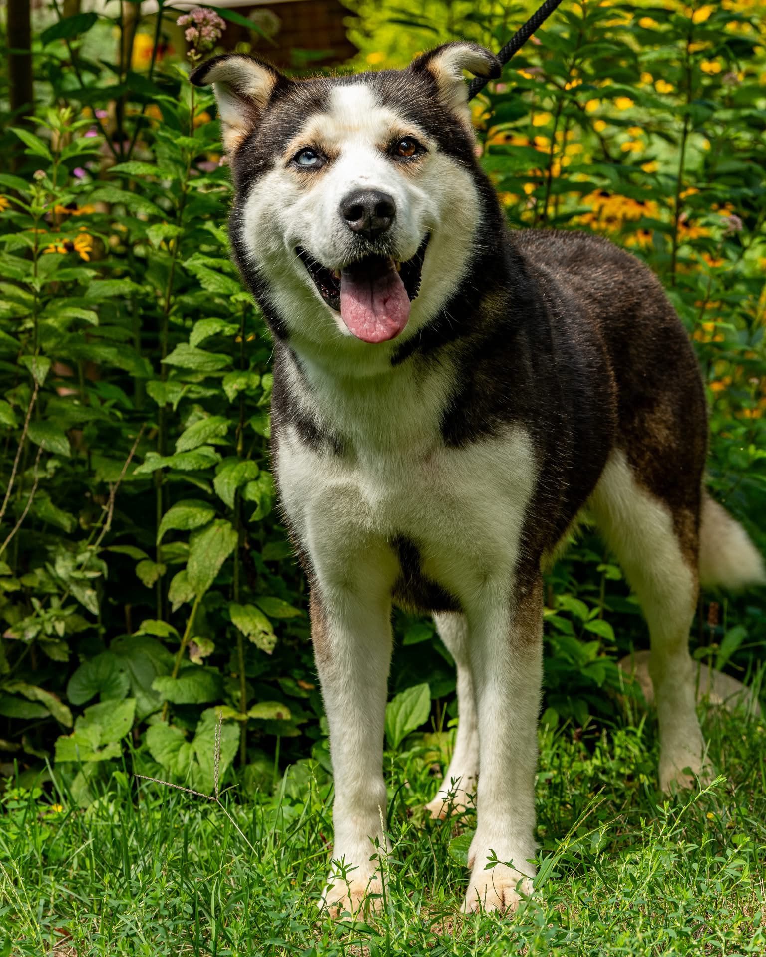 Please say hello to Mr. Nash! Nash is an approx. 6-year-old mixed breed boy who came to us from Moose Factory. This handsome boy is as sweet as he is striking, super cuddly, affectionate, and happiest when he’s soaking up love from his people.